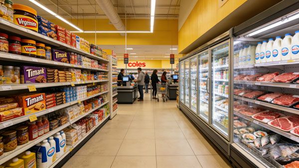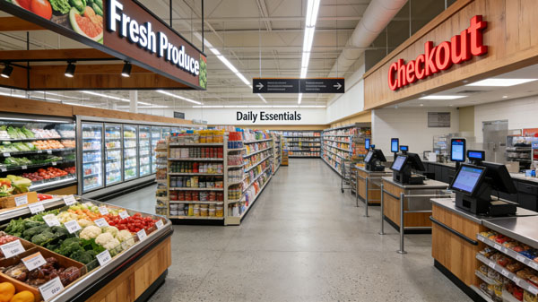 You’ve probably seen this layout everywhere—supermarkets, pharmacies, and convenience stores use it all the time. It’s made up of straight aisles with products lined up neatly on shelves on both sides.