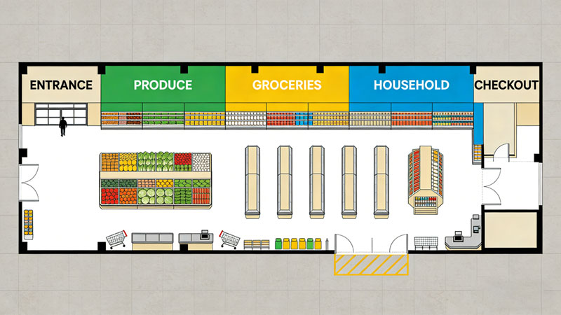 Best for: Stores with a wide range of products where customers browse systematically—think bookstores, grocery stores, or hardware shops.