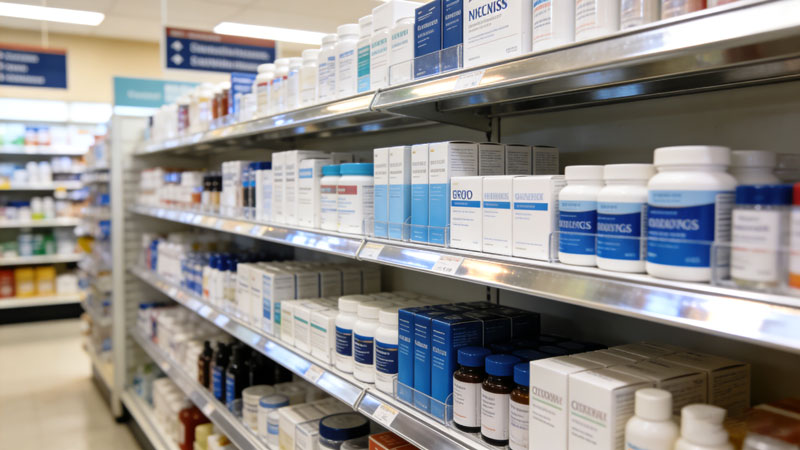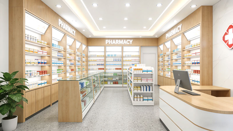 Pharmacies see high traffic and frequent cleaning, so materials need to be tough. Prioritize:
